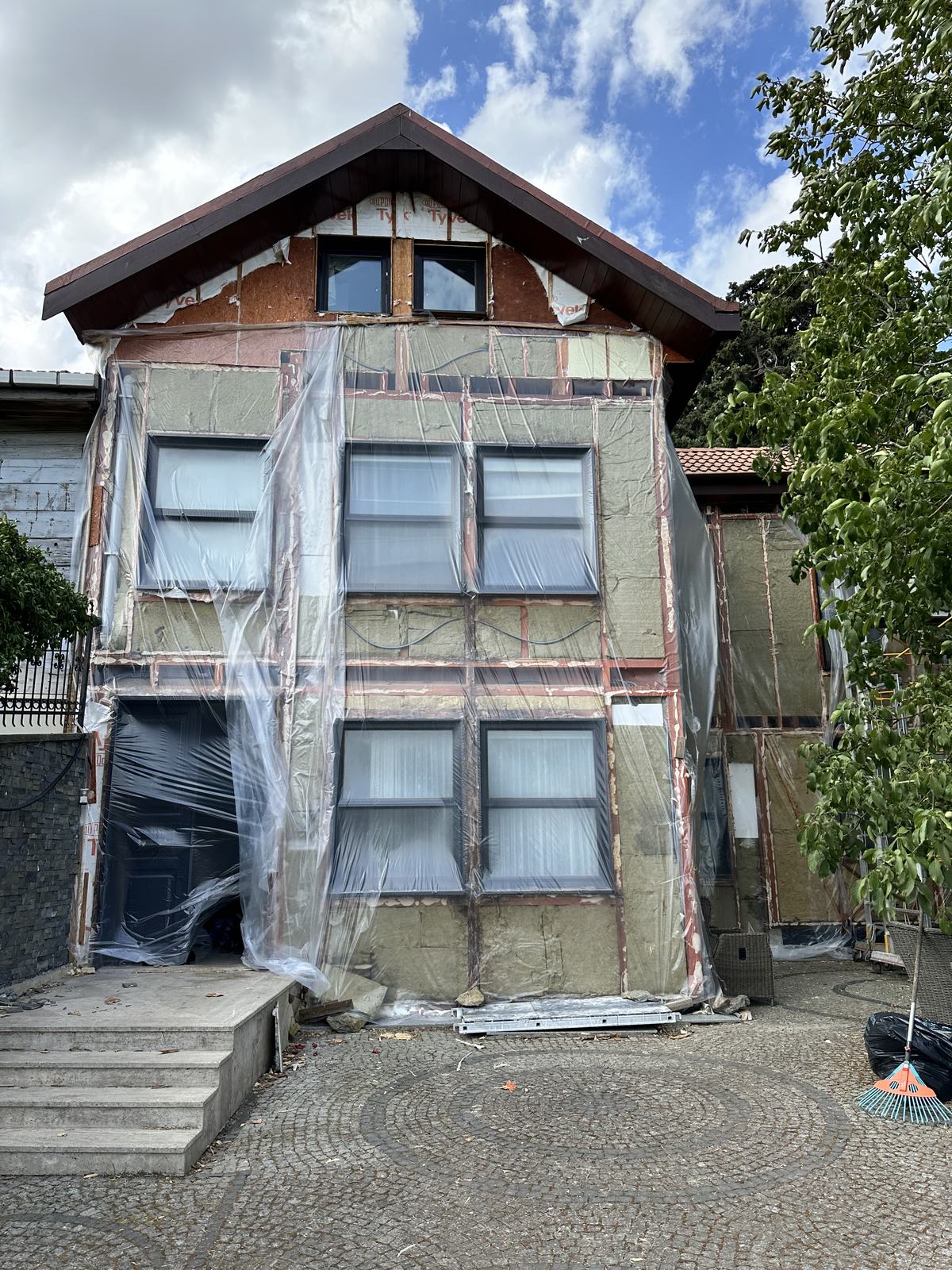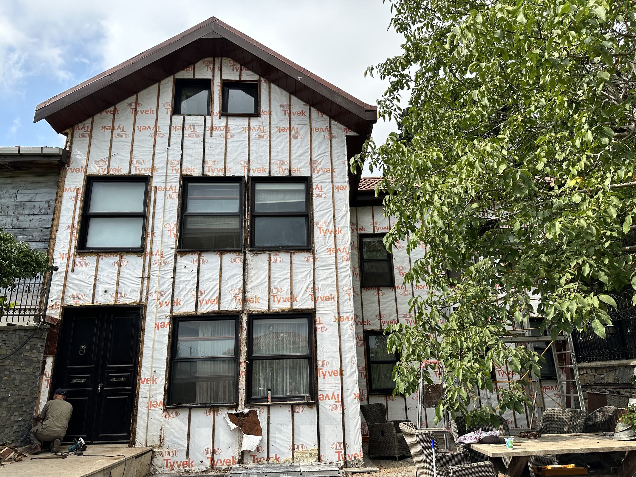 Yapılan teknik incelemeler sonucunda, dış cephede kullanılan mevcut çam esaslı ahşap kaplama ve taşıyıcı alt konstrüksiyon elemanları kontrollü biçimde demonte edilmiştir. Zararlıdan etkilenmiş tüm ahşap bileşenler yapıdan uzaklaştırılarak, yerine yüksek dayanım ve boyutsal stabilite sağlayan termo wood (ısıl işlem görmüş ahşap) malzeme uygulanmıştır.
