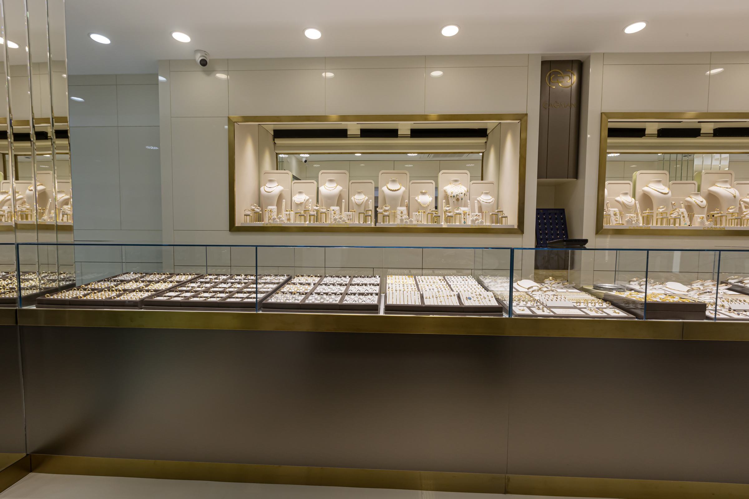 Kuyumcu mağazalarında güvenlik tasarımın ayrılmaz bir parçasıdır. Bu kapsamda, kamera sistemleri, alarm altyapısı ve sensör yerleşimleri mimari tasarıma entegre edilerek görünür karmaşa önlendi.
